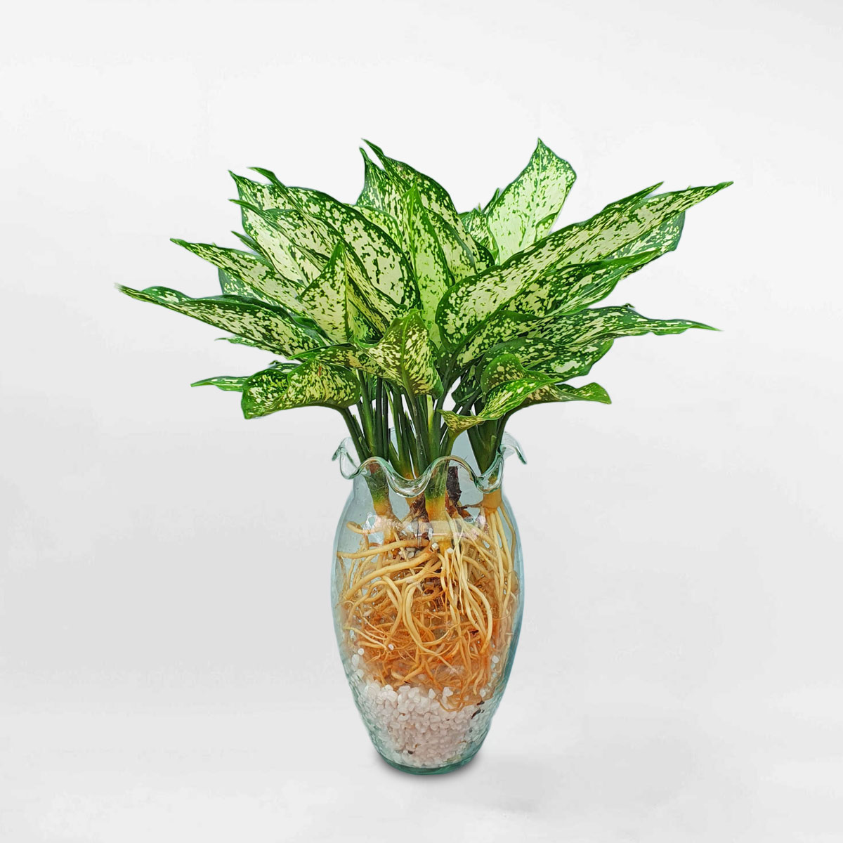 Với chiều cao dao động từ 20 đến 60 cm, cây Ngọc Ngân sở hữu lá màu xanh hình bầu dục và cuống lá dài bọc quanh thân. Đặc trưng của loài cây này là màu sắc độc đáo trên lá – màu trắng xanh đan xen lẫn nhau tạo nên một vẻ đẹp không thể lẫn với bất cứ loài cây nào. Lá cây tạo thành chùm xòe rộng mang đến nét thẩm mỹ độc đáo cho không gian sống và làm việc của bạn.